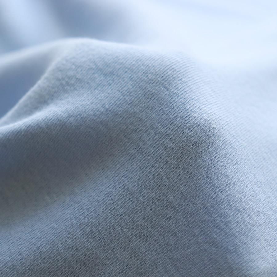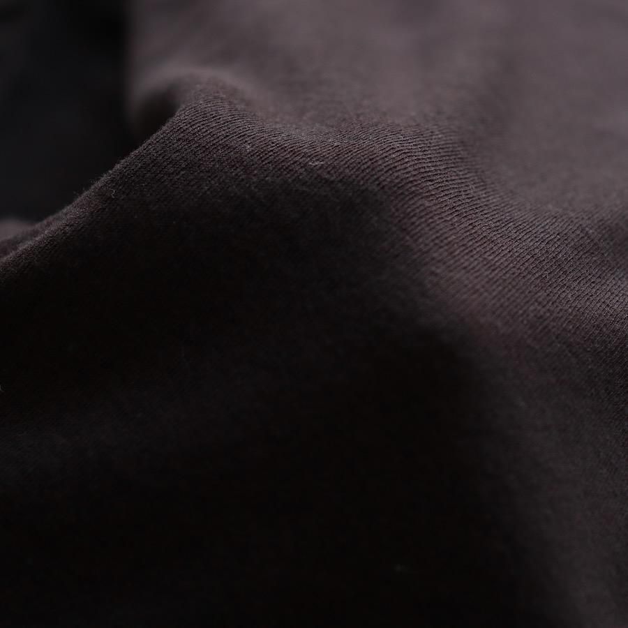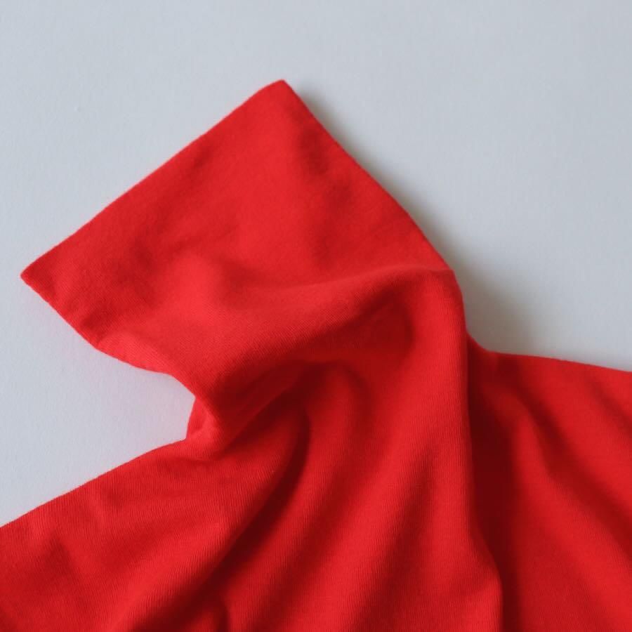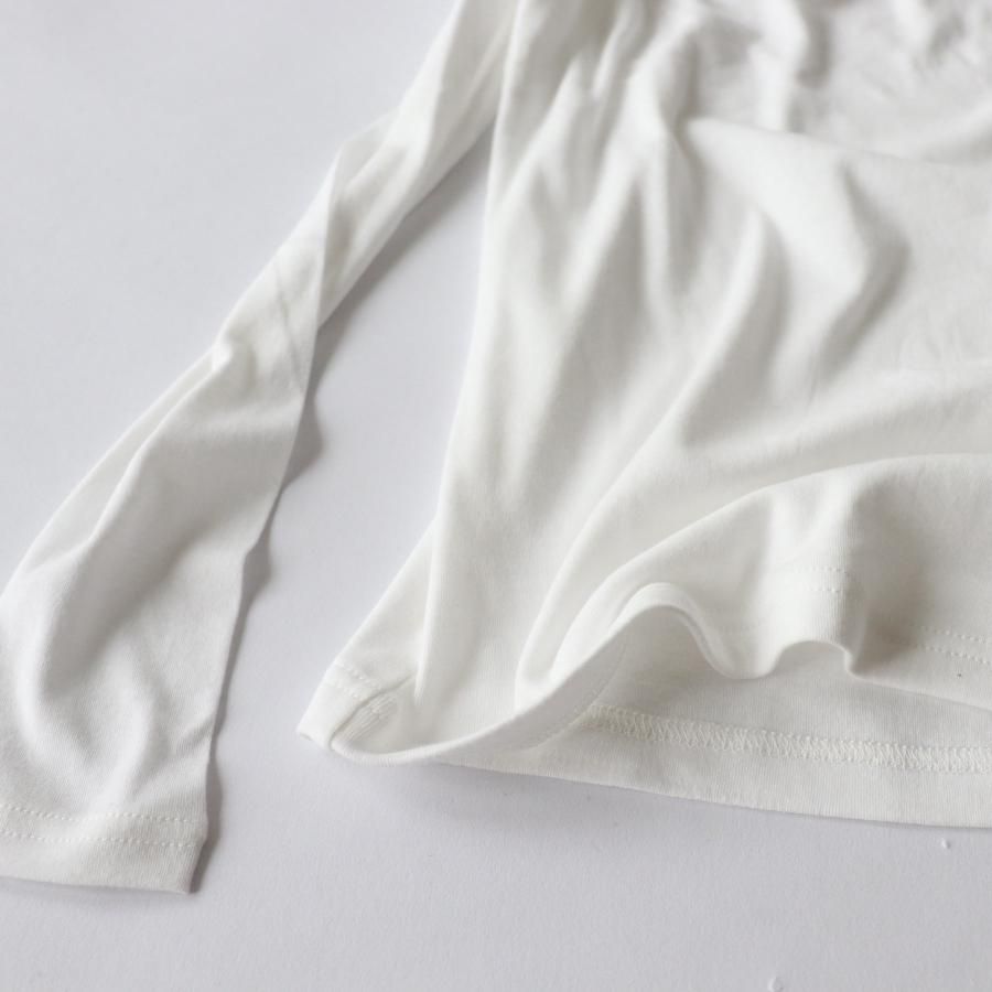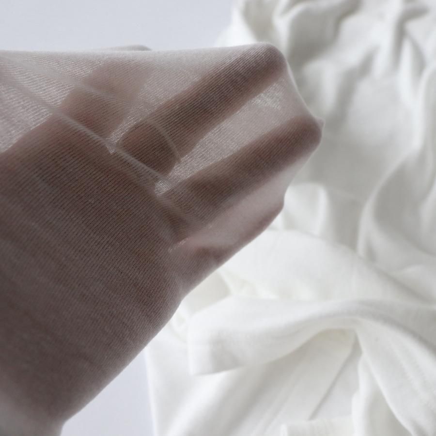 コットン100%の優しい伸縮性が体を締め付ける事無く着⽤する⽅のカタチに寄りそってくれます。強撚⽷という撚り回数の多い⽷を使⽤していますので、⽔分を含むと撚りが戻り固く締まって収縮した状態になります。また乾かす事で元のサイズ感、感触に戻りますので洗濯ネットをご使⽤した洗濯機の使⽤、そしてタンブラーの使⽤も可能です。とても薄手で柔らかな素材ですがお洗濯に強い事にも驚きます。