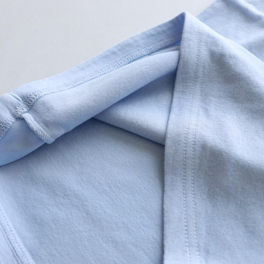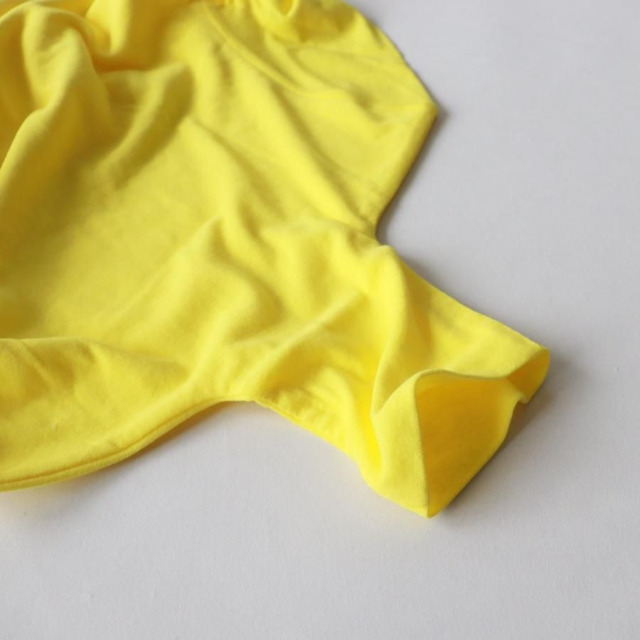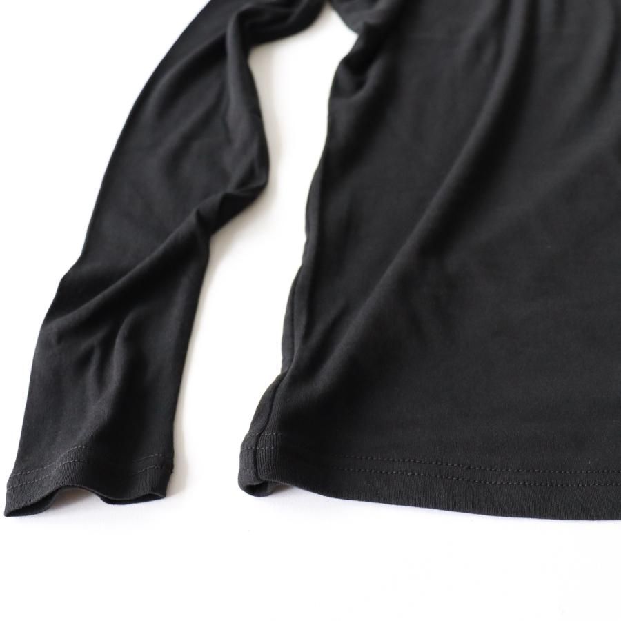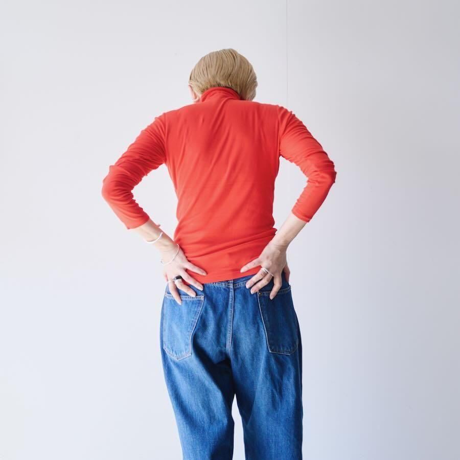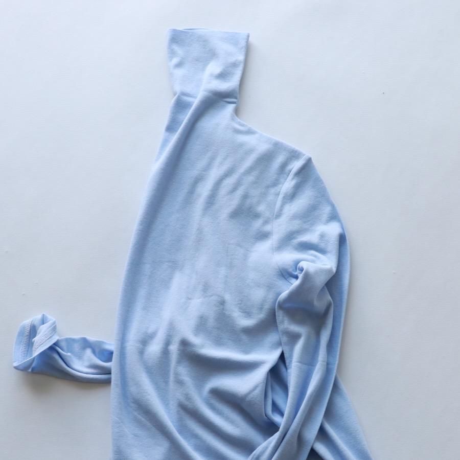 コットン100%の優しい伸縮性が体を締め付ける事無く着⽤する⽅のカタチに寄りそってくれます。強撚⽷という撚り回数の多い⽷を使⽤していますので、⽔分を含むと撚りが戻り固く締まって収縮した状態になります。また乾かす事で元のサイズ感、感触に戻りますので洗濯ネットをご使⽤した洗濯機の使⽤、そしてタンブラーの使⽤も可能です。とても薄手で柔らかな素材ですがお洗濯に強い事にも驚きます。