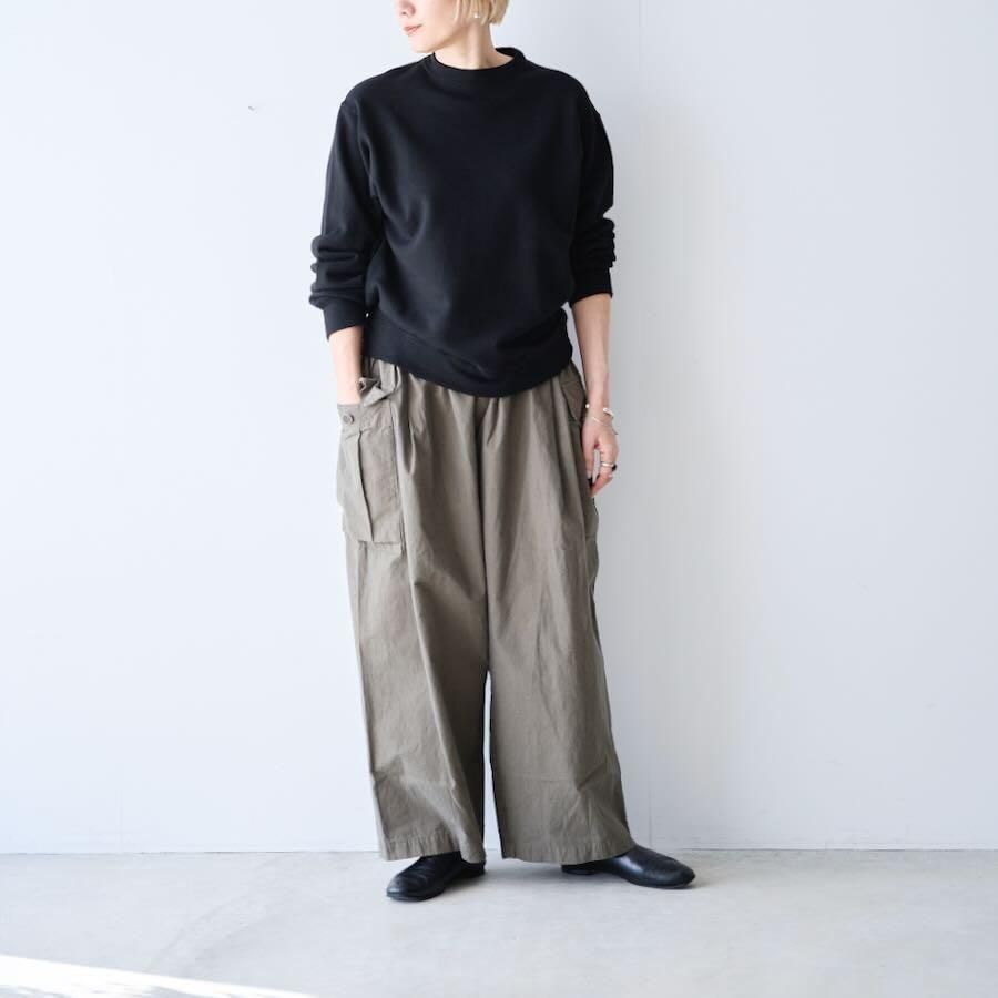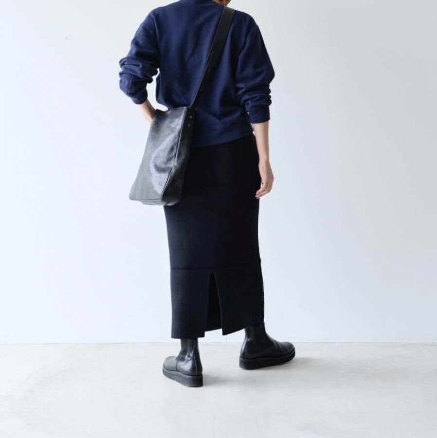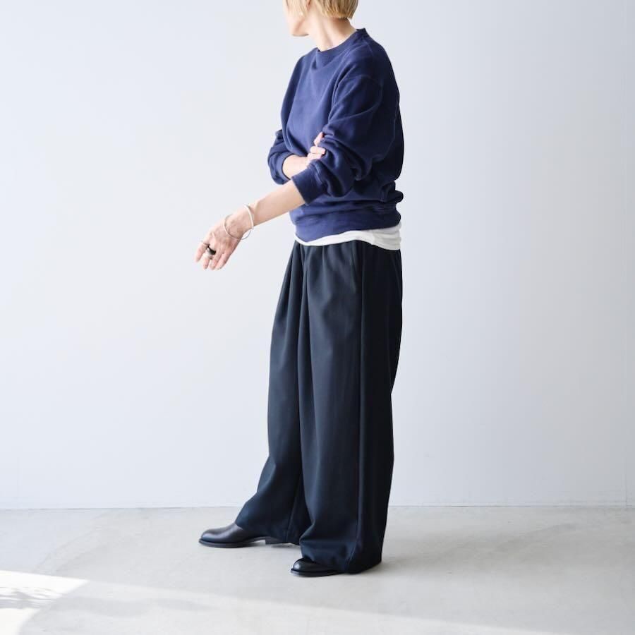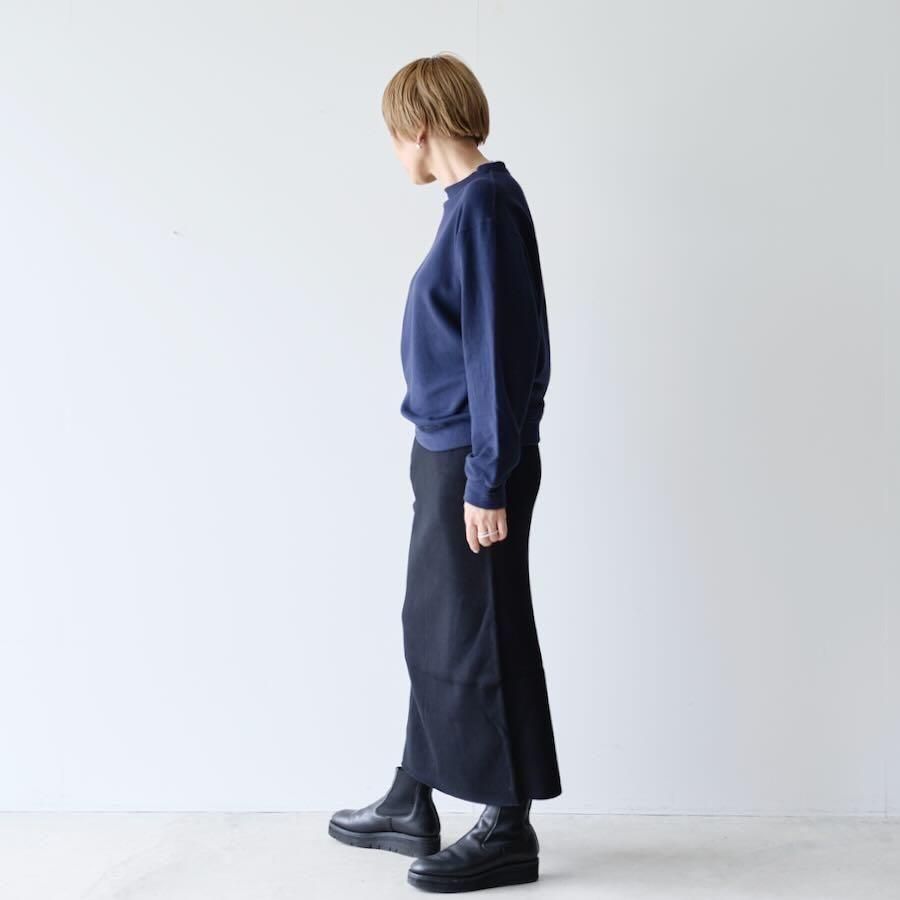 スカートやスラックスなどきれいなボトムの崩しにもクルーネックのプルオーバーはいい仕事します。