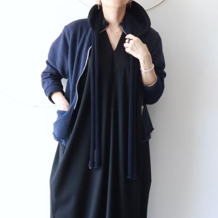 落ち感のある素材とシックな色めも相まってフードですが
