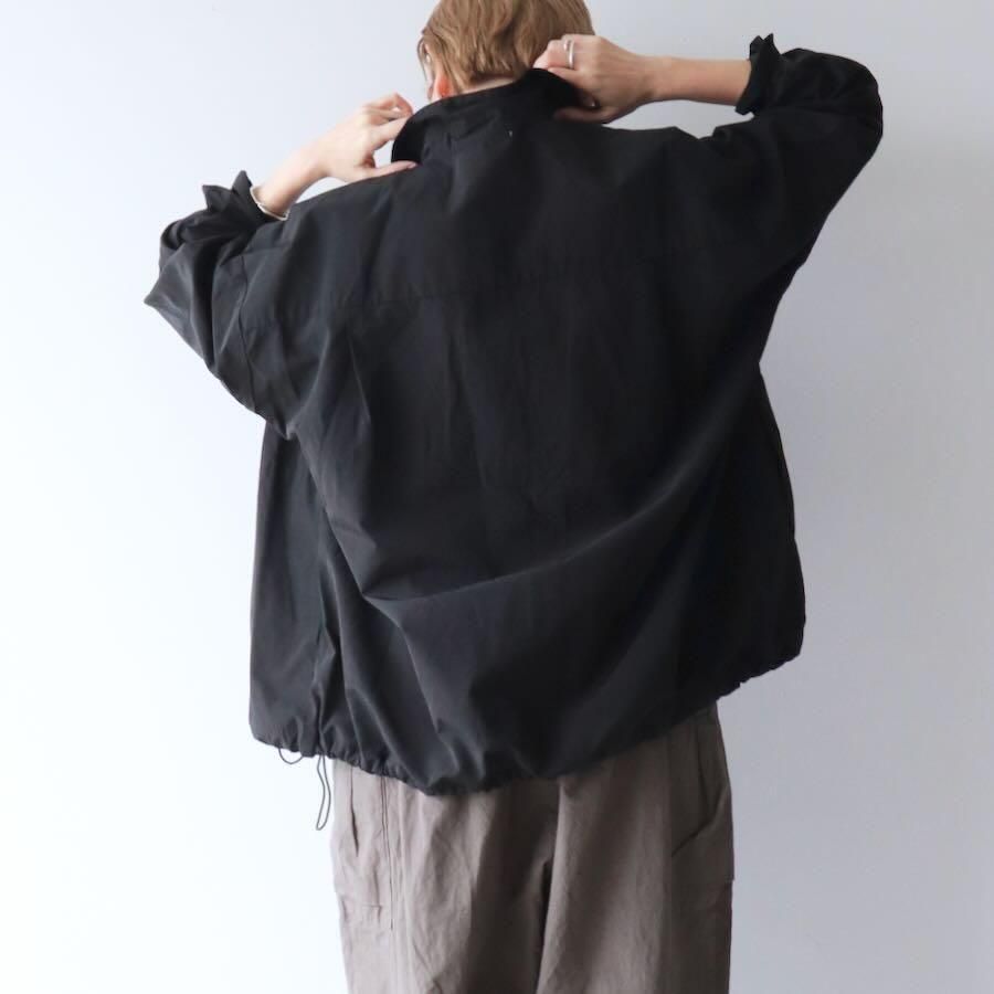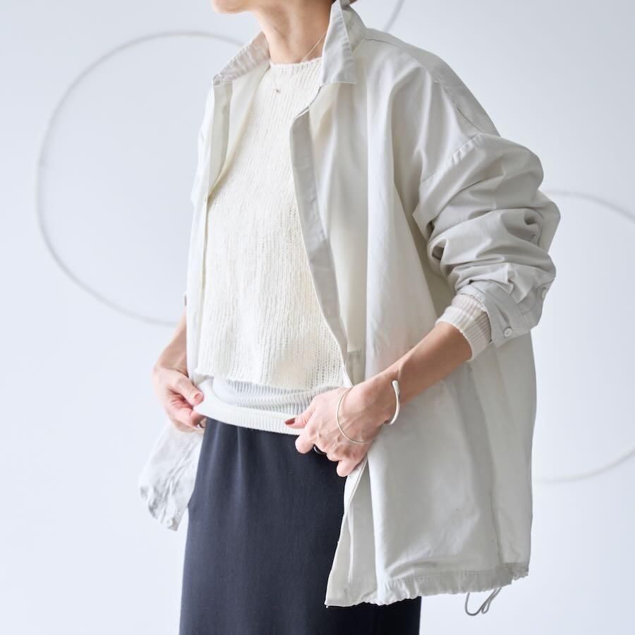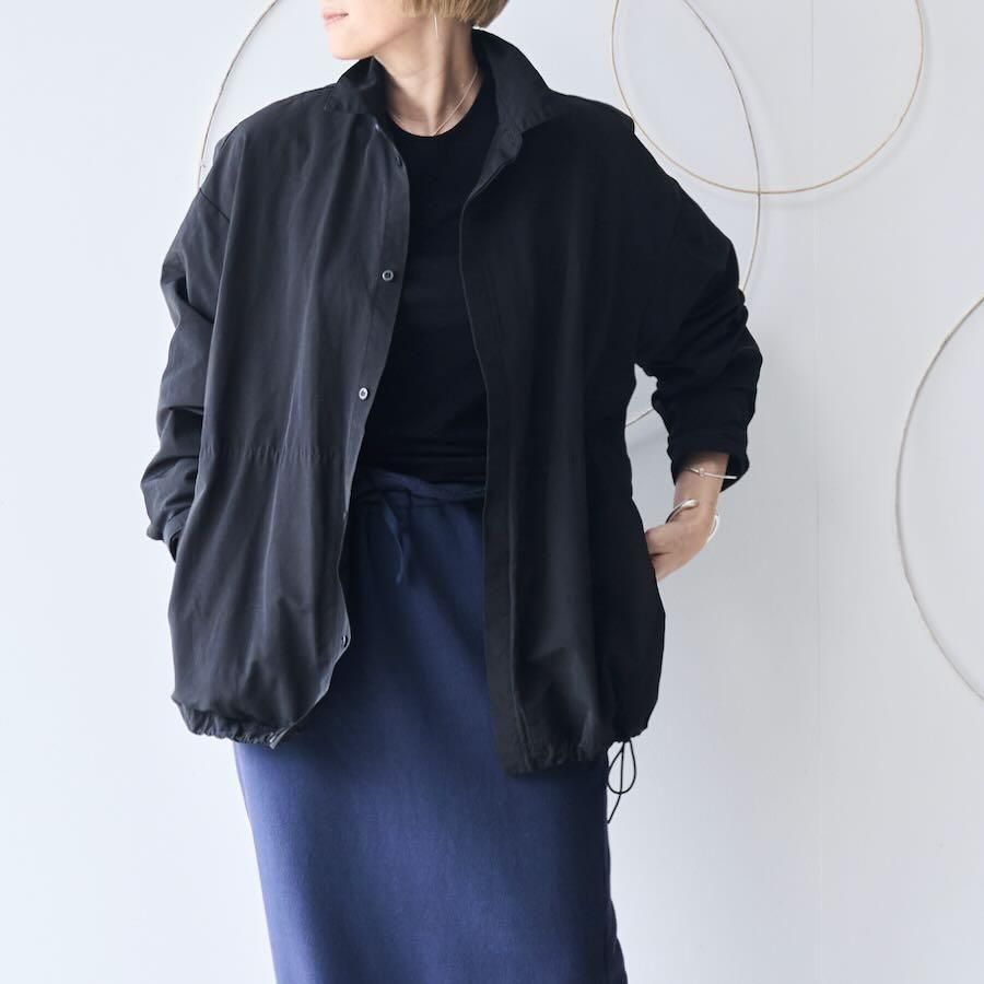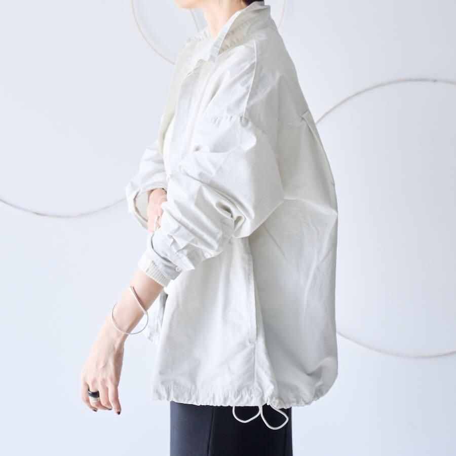 ドローストリングを絞るとブルゾンやコーチジャケットのような雰囲気もあります。