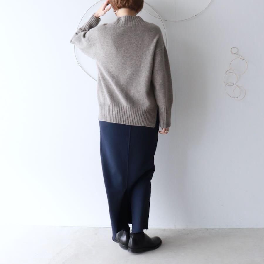 程よい立ち上がりのワイドなボトルネックで首元もすっきりと。