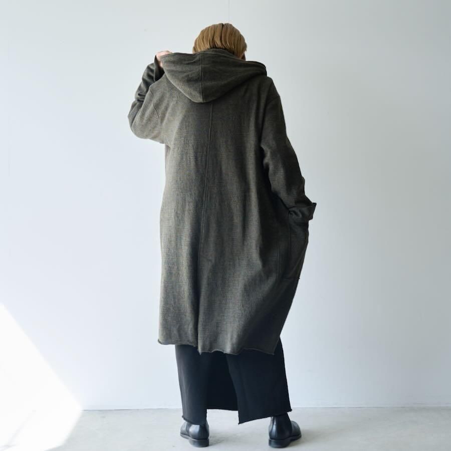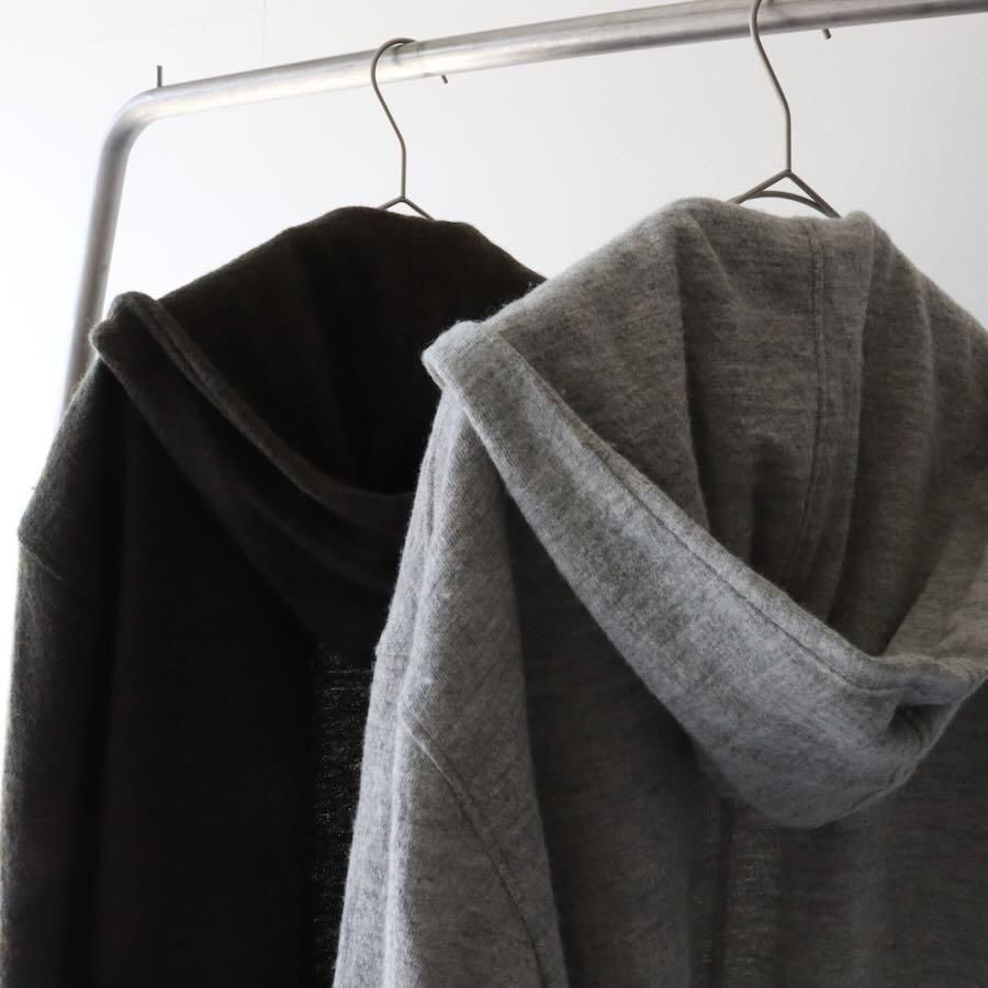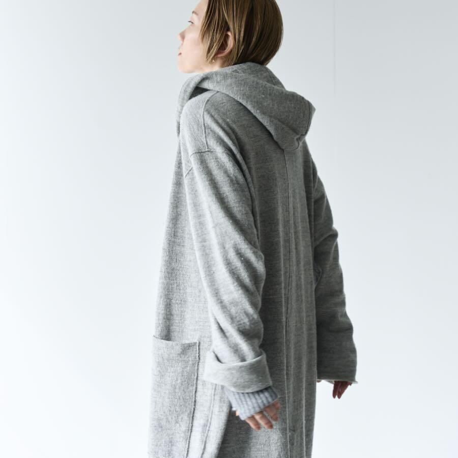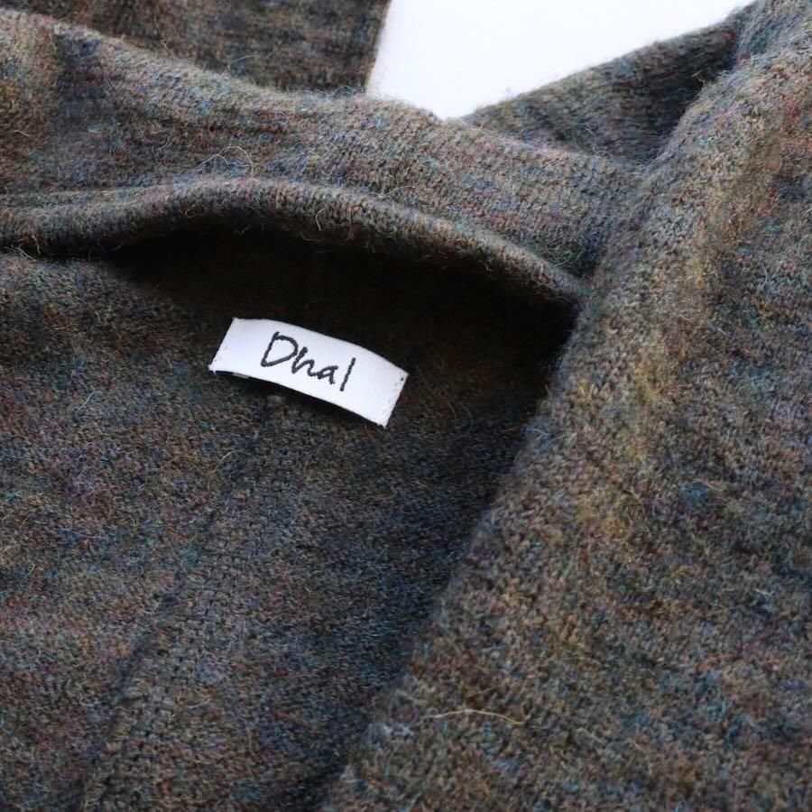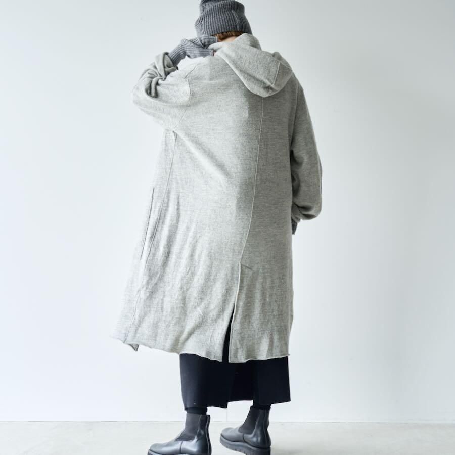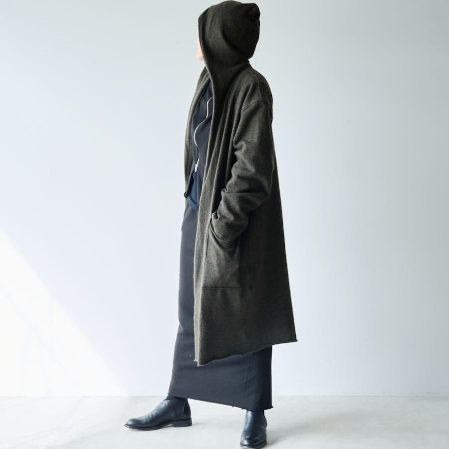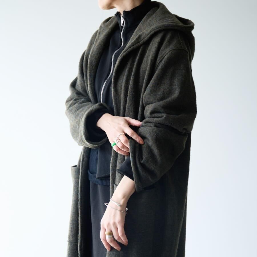 ふわっと軽く、暖かな縮絨ニットのフードコートです。ゆったりとしたガウン調のデザインでリラックス感はありながら、洗練された雰囲気を醸し出すのはやはりDhalならでは。店頭でご覧いただいたお客様から『只者ではない雰囲気を感じた』とのお言葉をいただきました、笑。美しい素材感からなのか、このコートはなんだかフードを被りたくなる衝動に駆られます。北風の冷たい時には颯爽と被って出かけたいです。