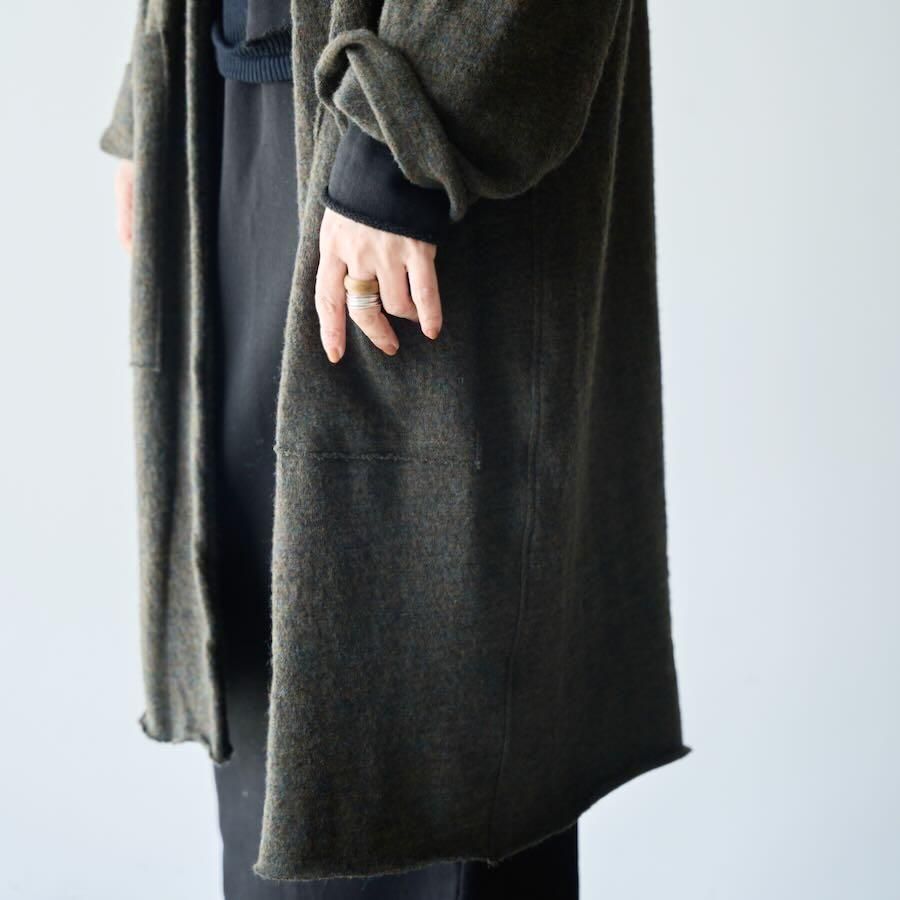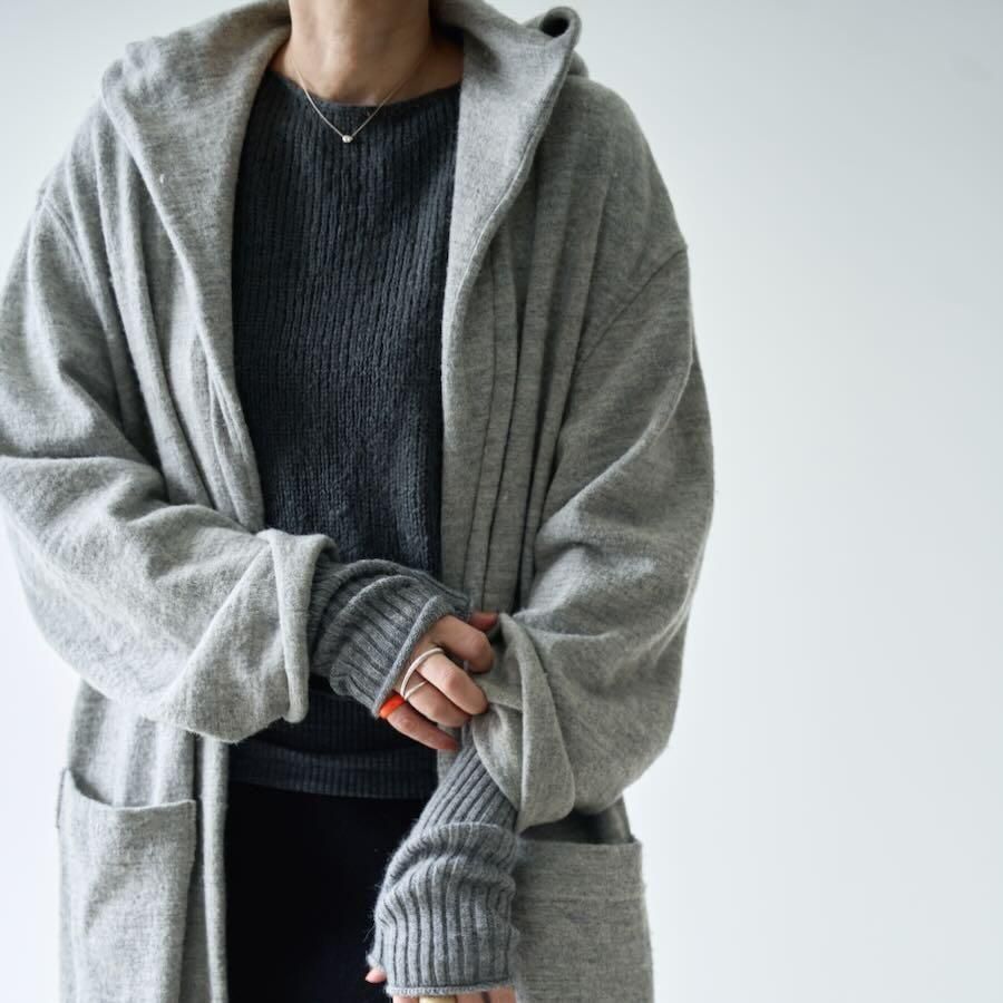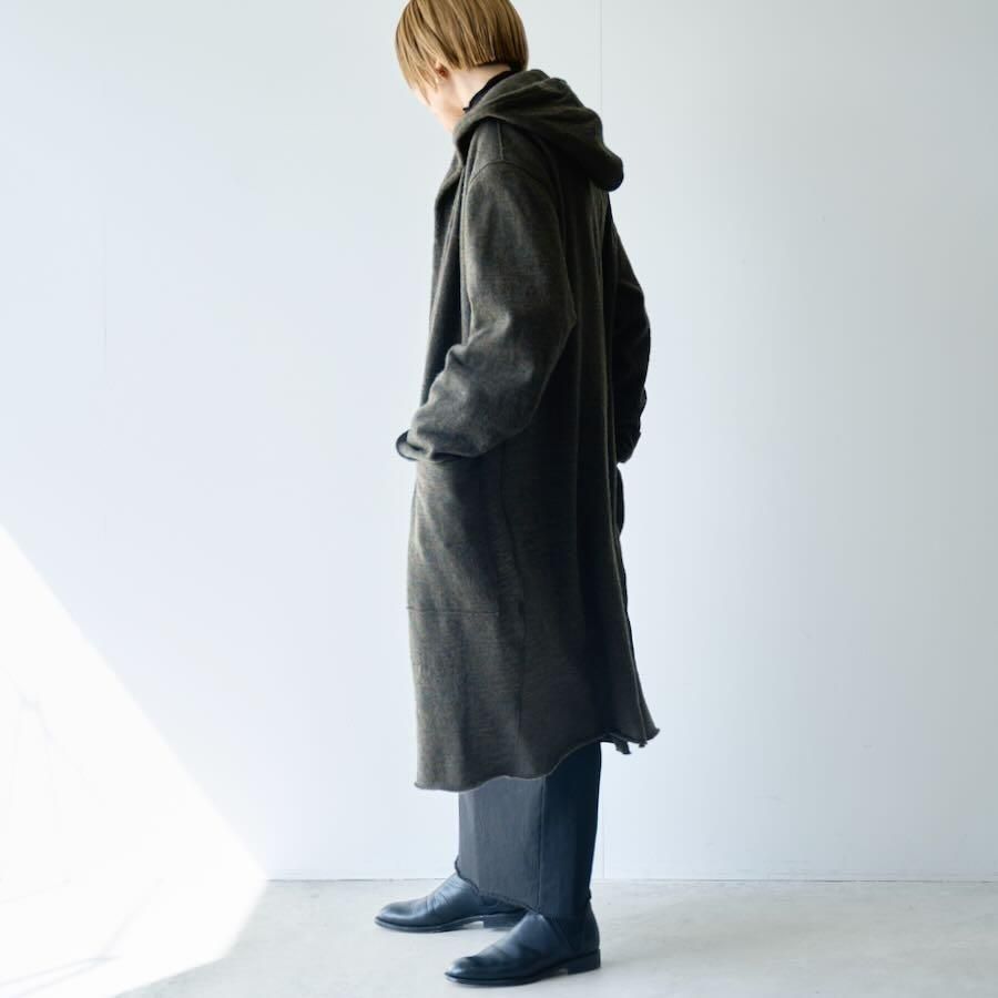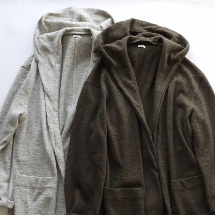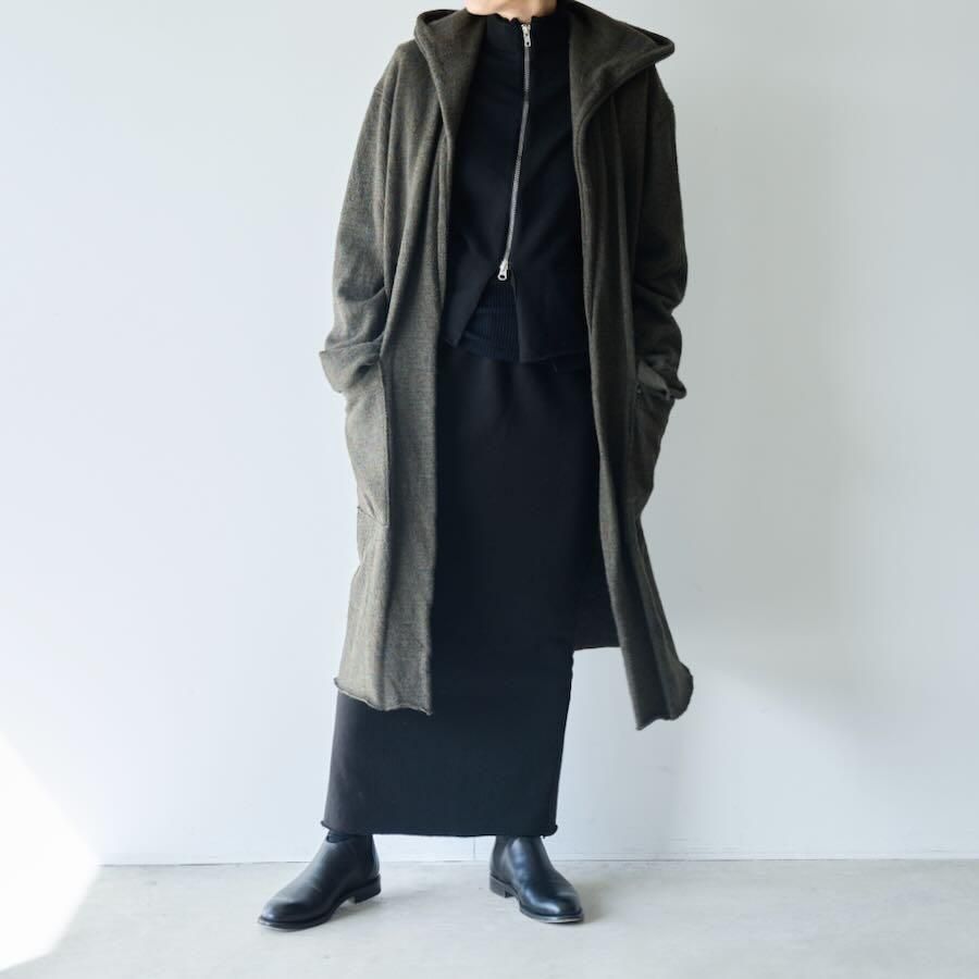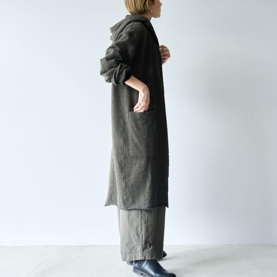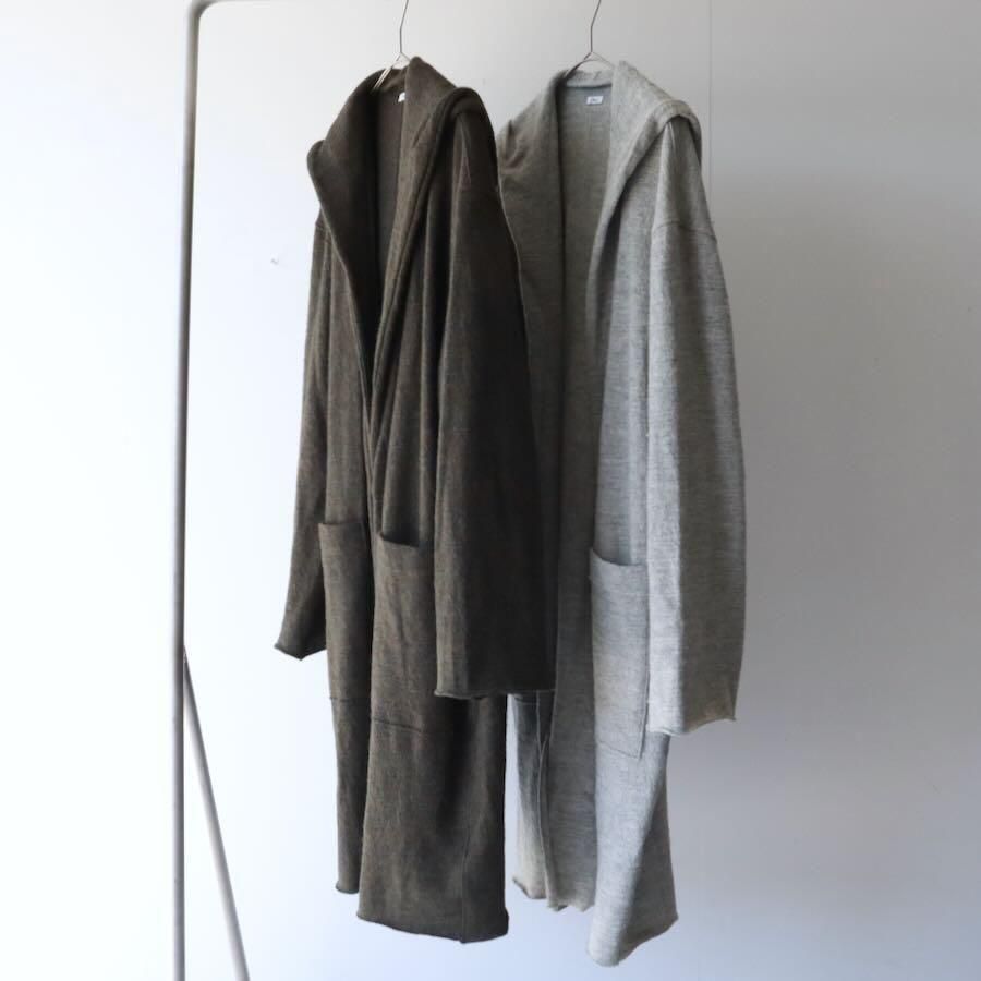 ふわっと軽く、暖かな縮絨ニットのフードコートです。ゆったりとしたガウン調のデザインでリラックス感はありながら、洗練された雰囲気を醸し出すのはやはりDhalならでは。店頭でご覧いただいたお客様から『只者ではない雰囲気を感じた』とのお言葉をいただきました、笑。美しい素材感からなのか、このコートはなんだかフードを被りたくなる衝動に駆られます。北風の冷たい時には颯爽と被って出かけたいです。