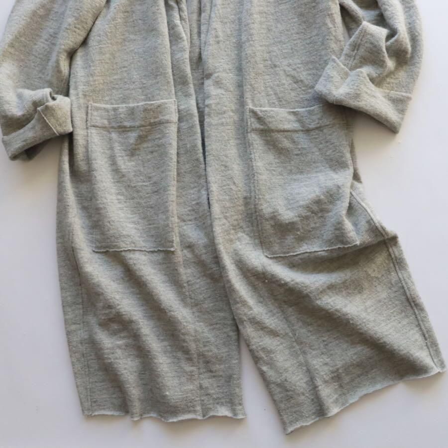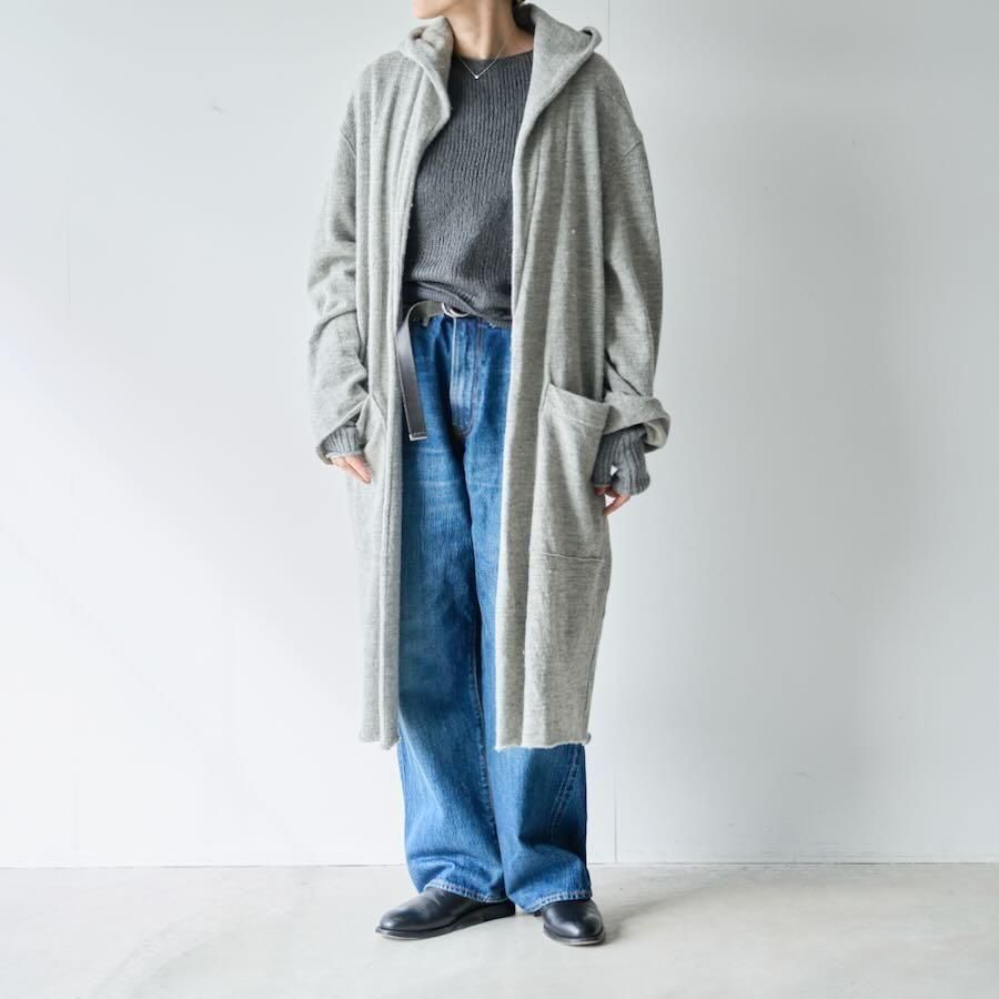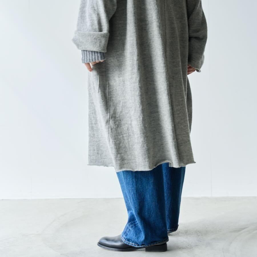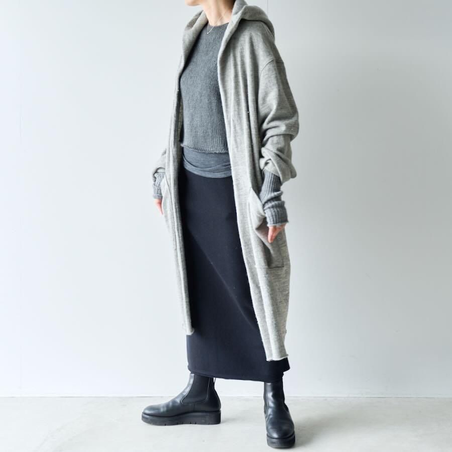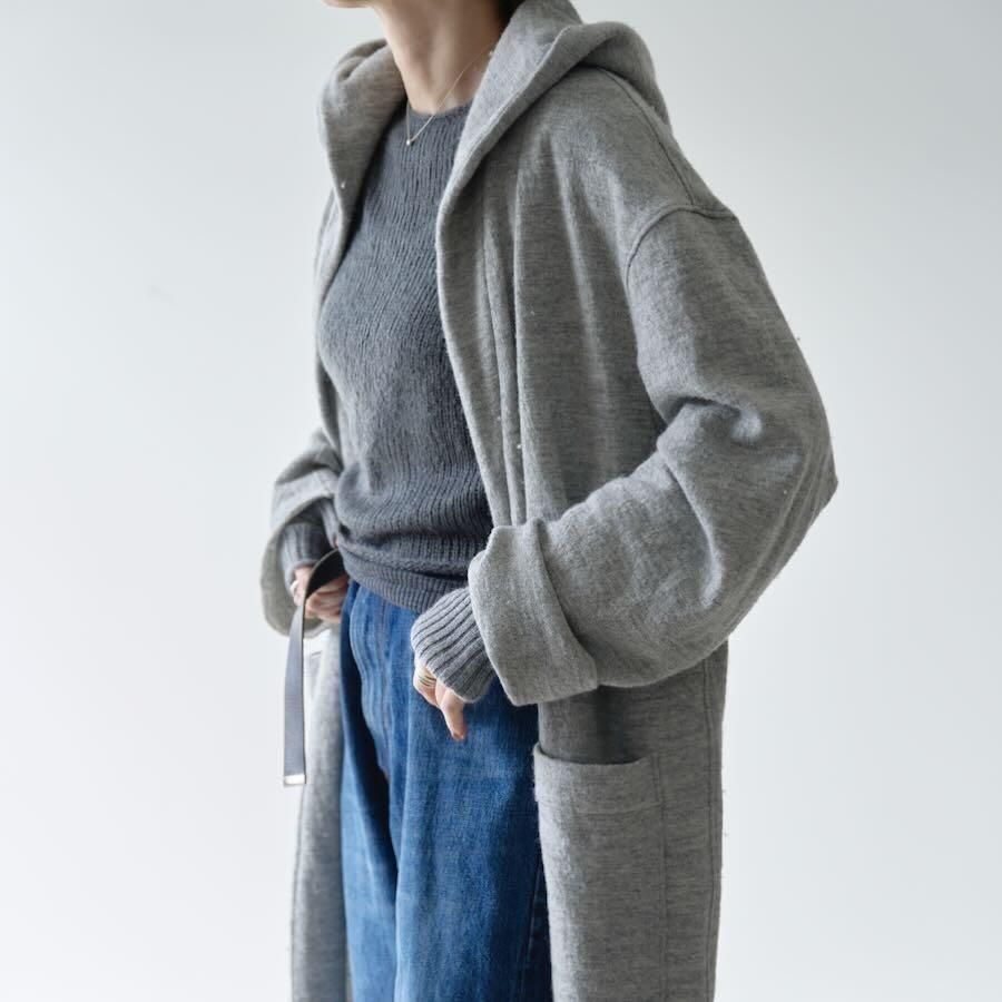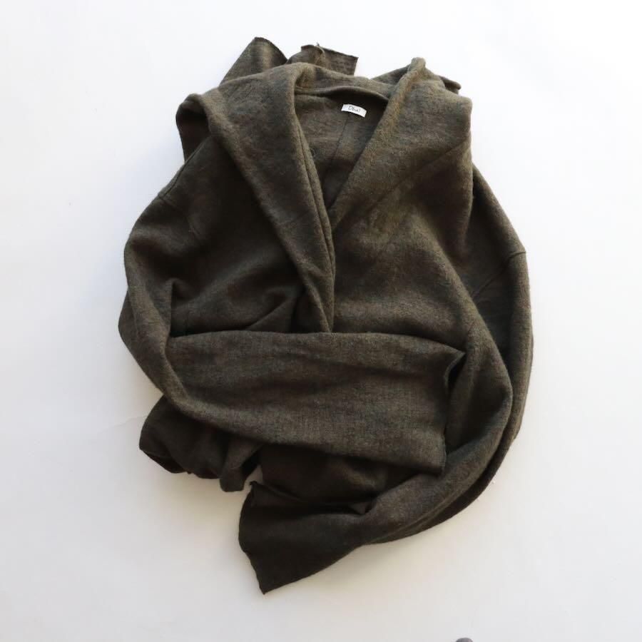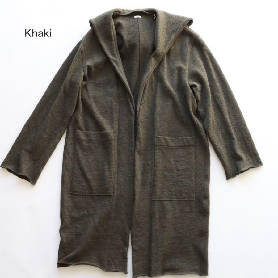 ふわっと軽く、暖かな縮絨ニットのフードコートです。ゆったりとしたガウン調のデザインでリラックス感はありながら、洗練された雰囲気を醸し出すのはやはりDhalならでは。店頭でご覧いただいたお客様から『只者ではない雰囲気を感じた』とのお言葉をいただきました、笑。美しい素材感からなのか、このコートはなんだかフードを被りたくなる衝動に駆られます。北風の冷たい時には颯爽と被って出かけたいです。