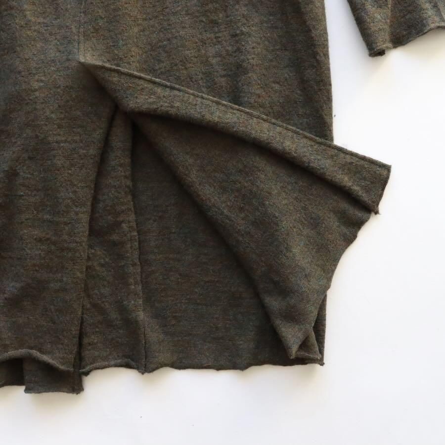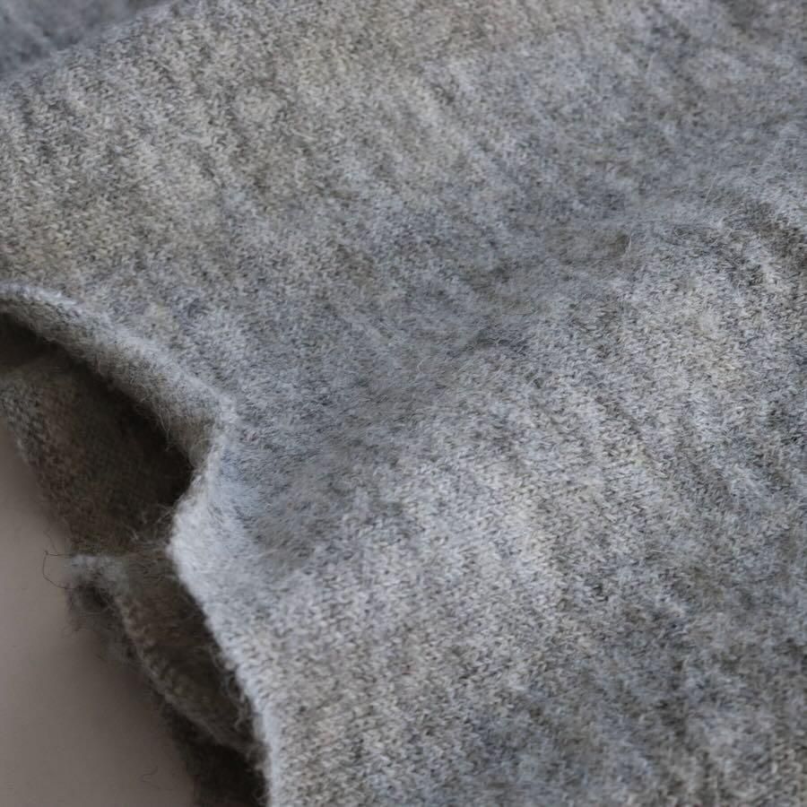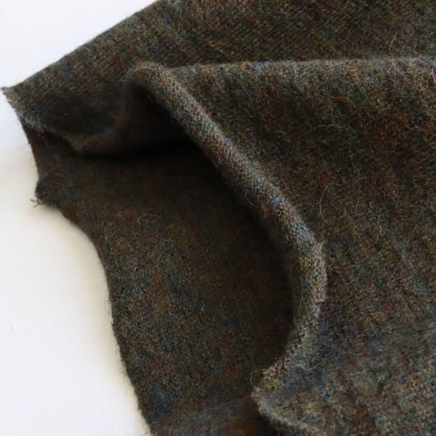 ウールの産地尾州にて、メゾンブランド等を手掛けるニッターさんが編み立てた生地。原料(ワタ)の段階からオリジナル3色に染めたシェットランドの糸に、コットンを撚り合わせた美しいメランジ感が特徴の生地。仕上げに縮絨加工を入れ、シェットランドウール特有の粗野感、ふくらみを引き出しています。