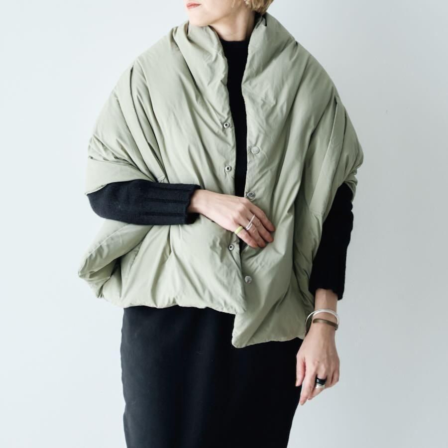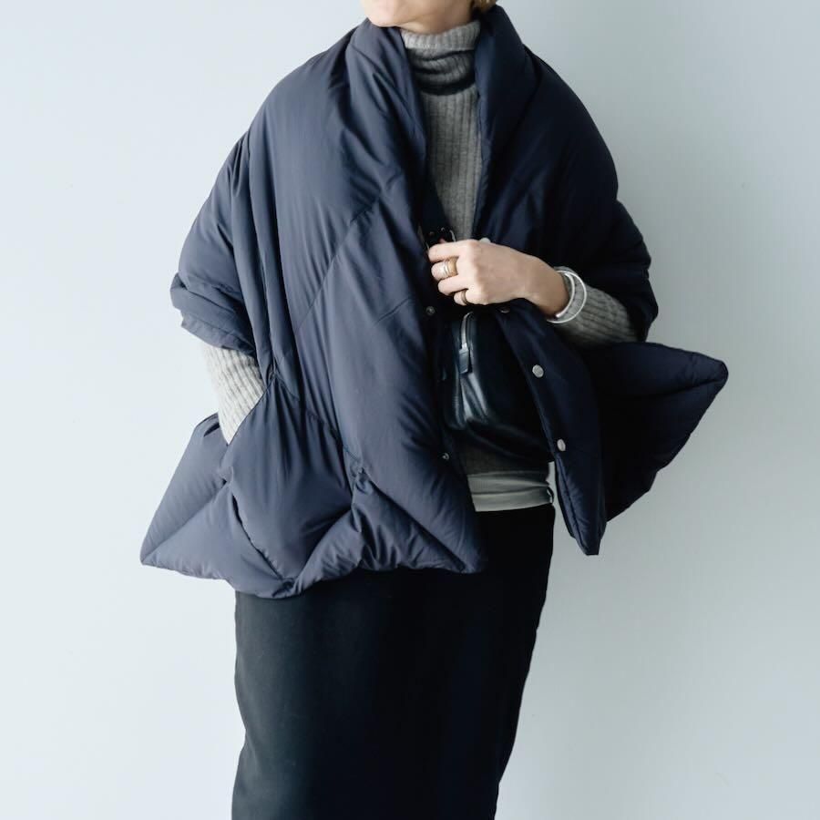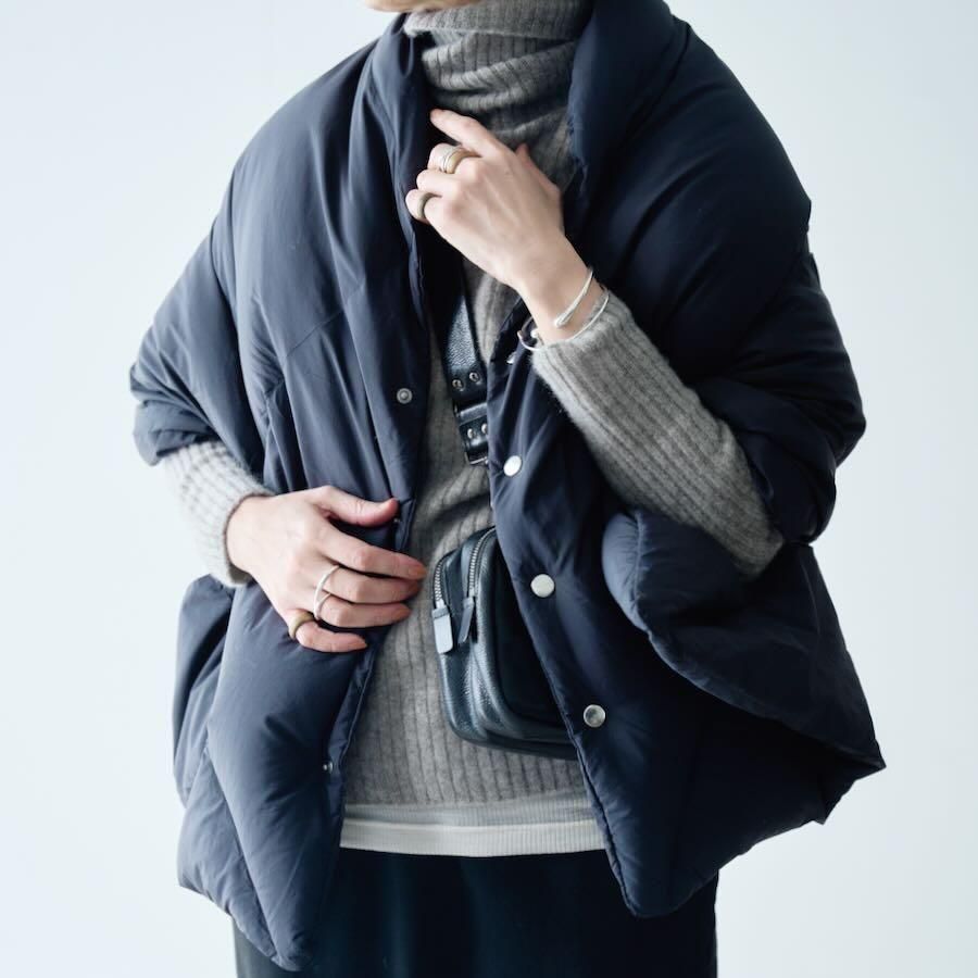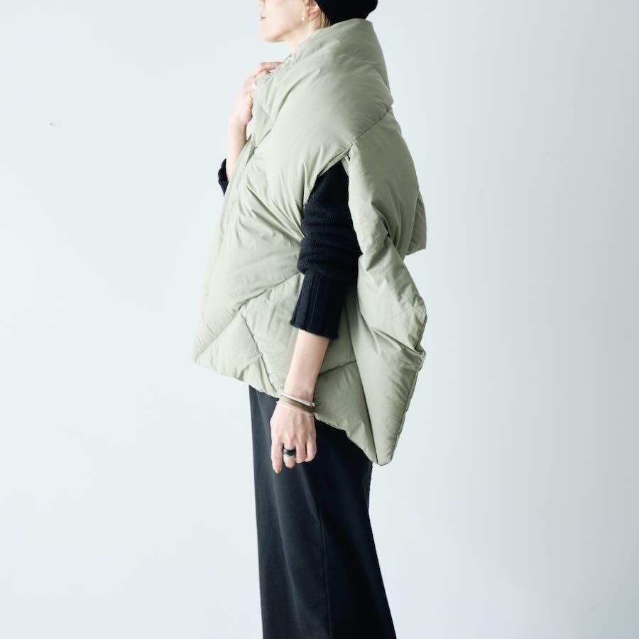ステッチワークのアレンジで表裏の表情に変化をつけたリバーシブルのダウンケープです。