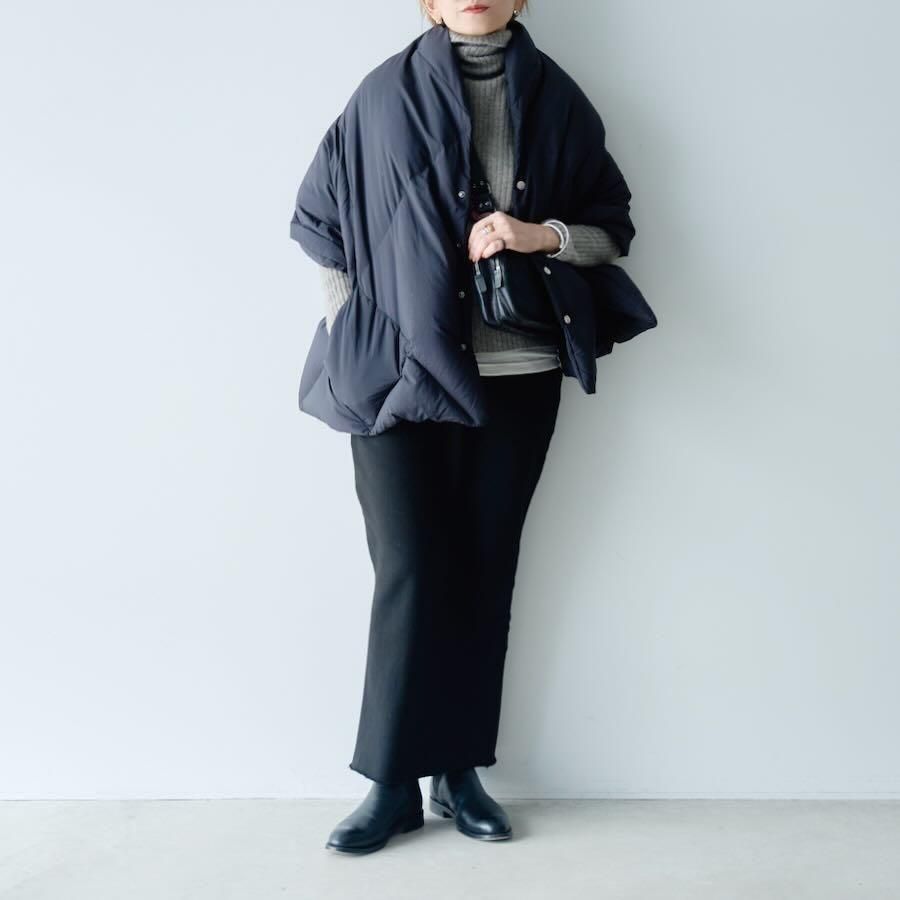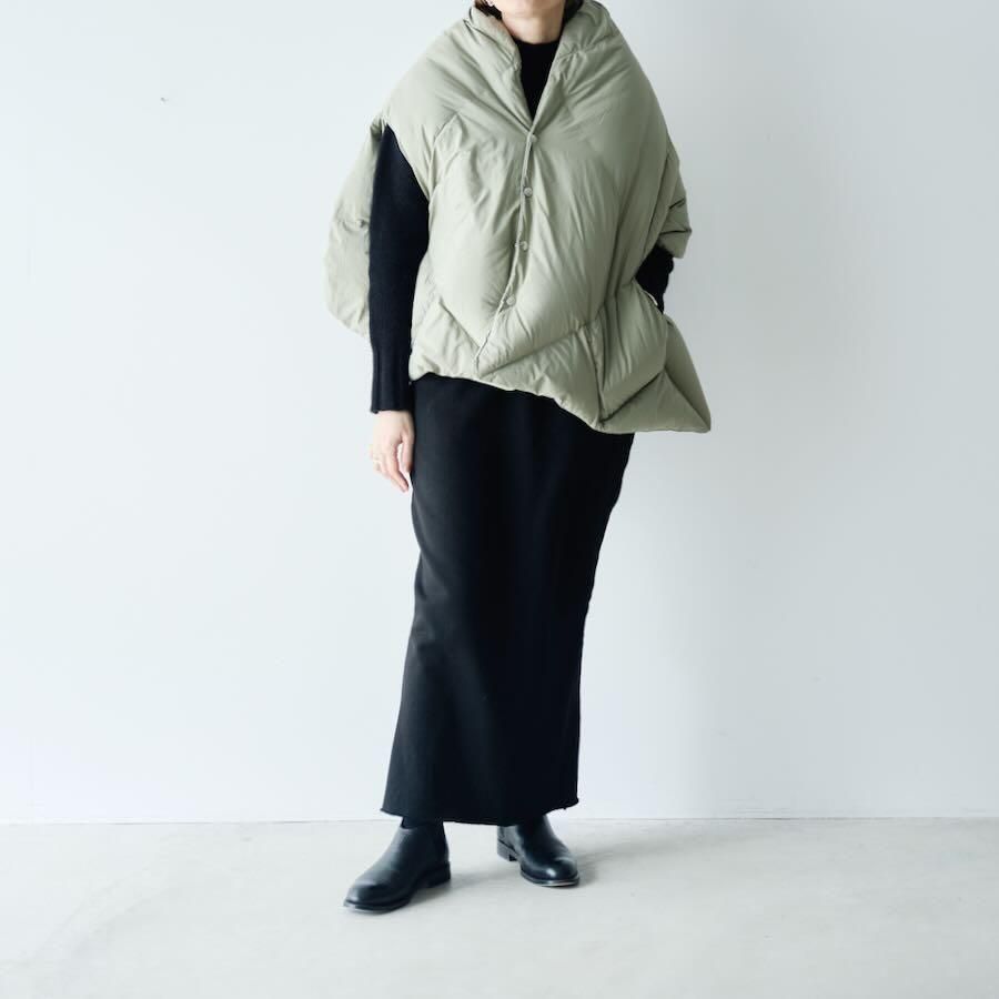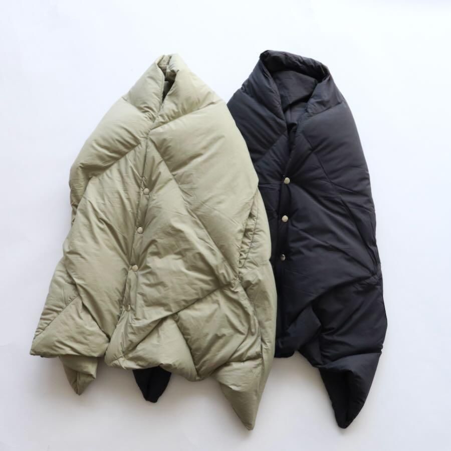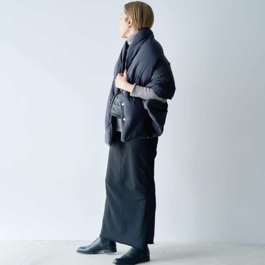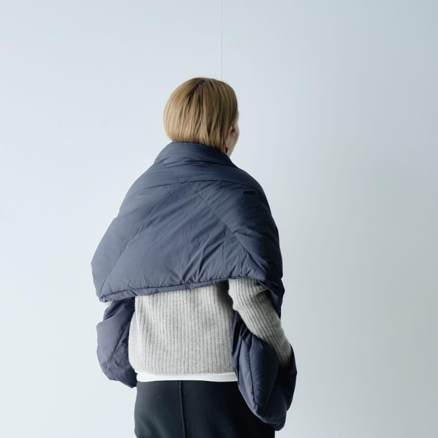 ステッチワークのアレンジで表裏の表情に変化をつけたリバーシブルのダウンケープです。